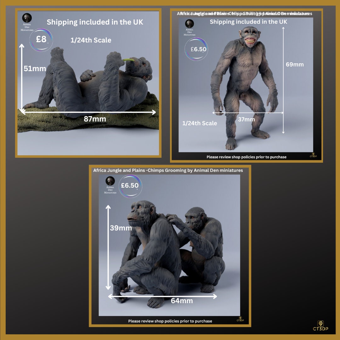 Chimps Chilling, Grooming, and Smiling. What could be better? A superb set of models for the avid miniature animal model collector. This is part of Animal Dens Africa jungle and plains collection. Simply stunning models. Get one model or all three make your choice at checkout
