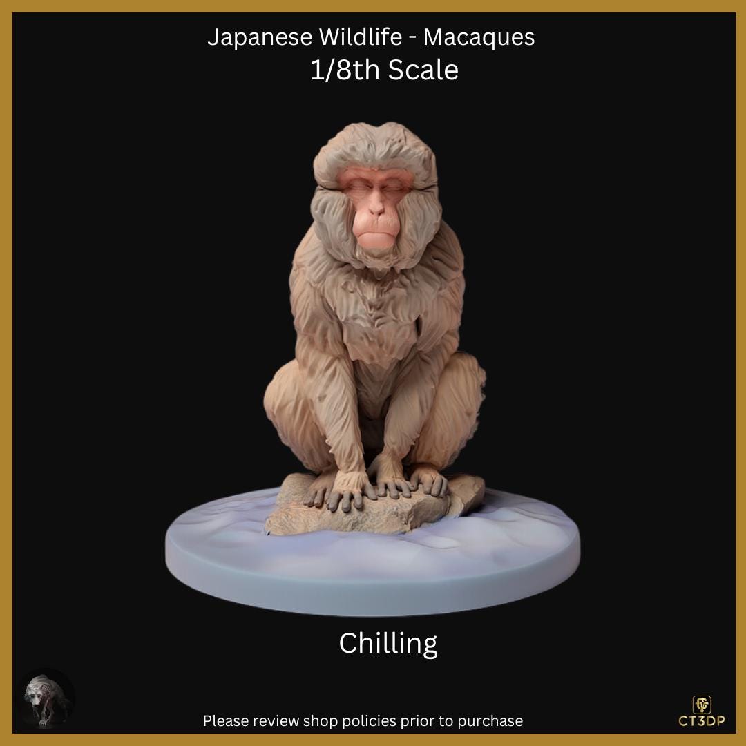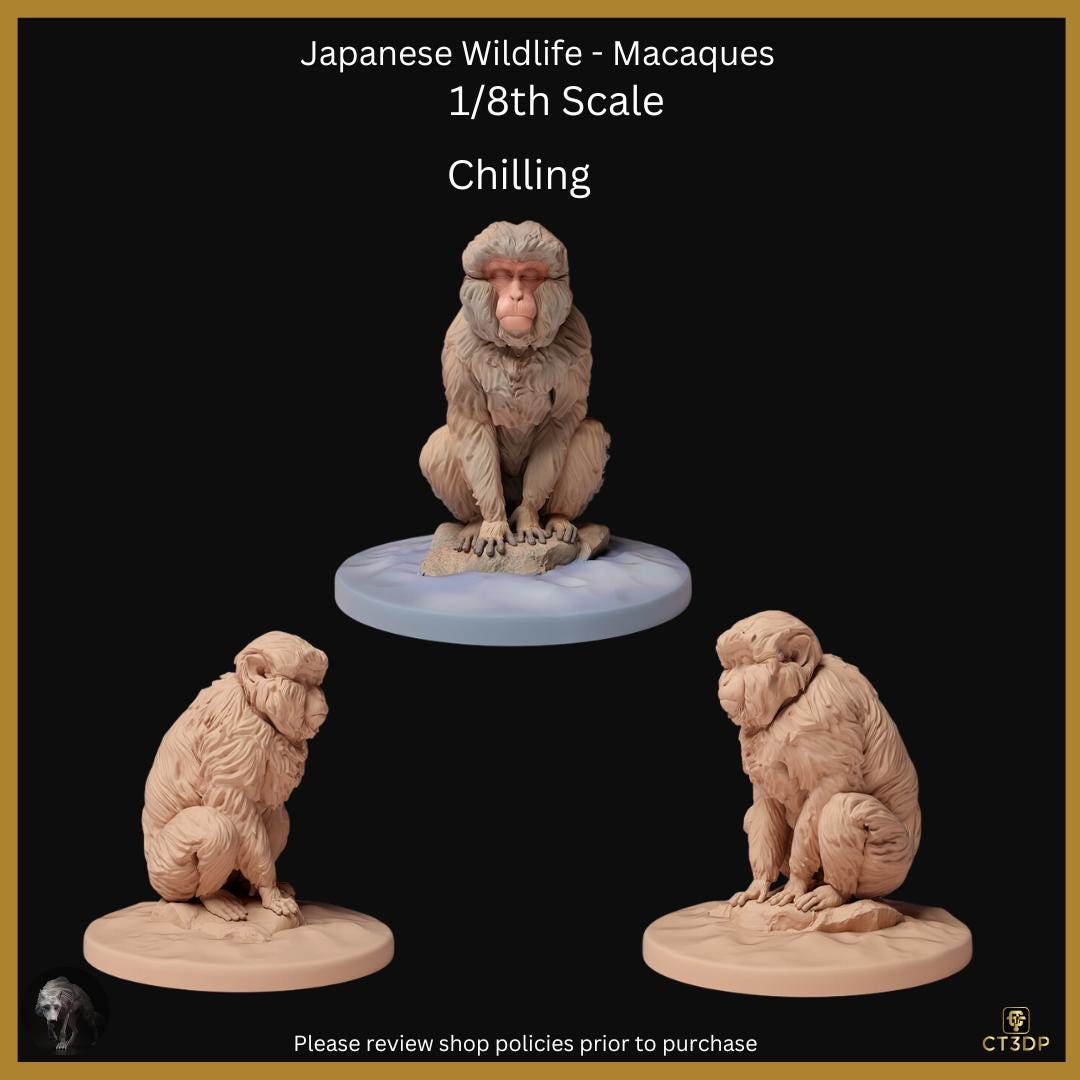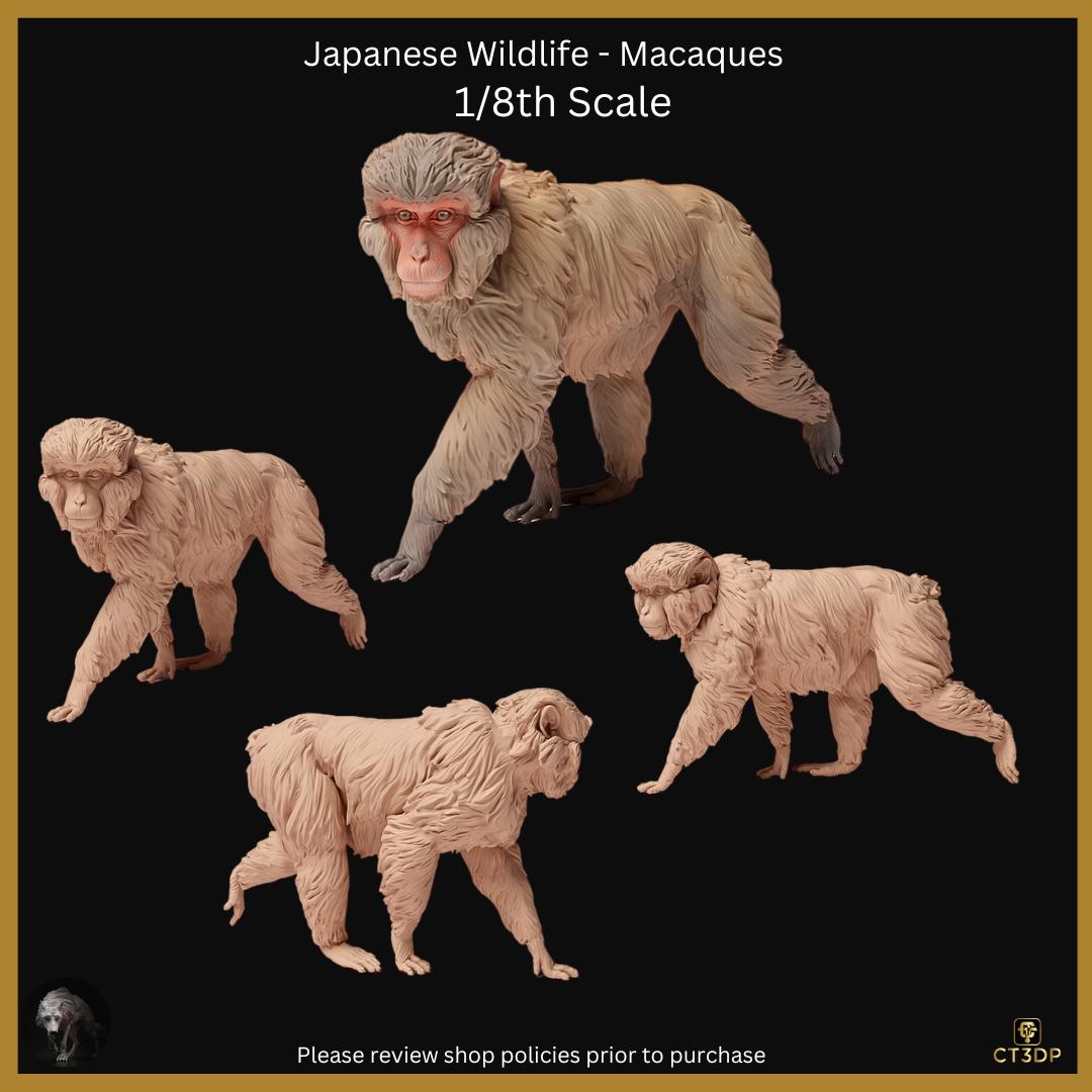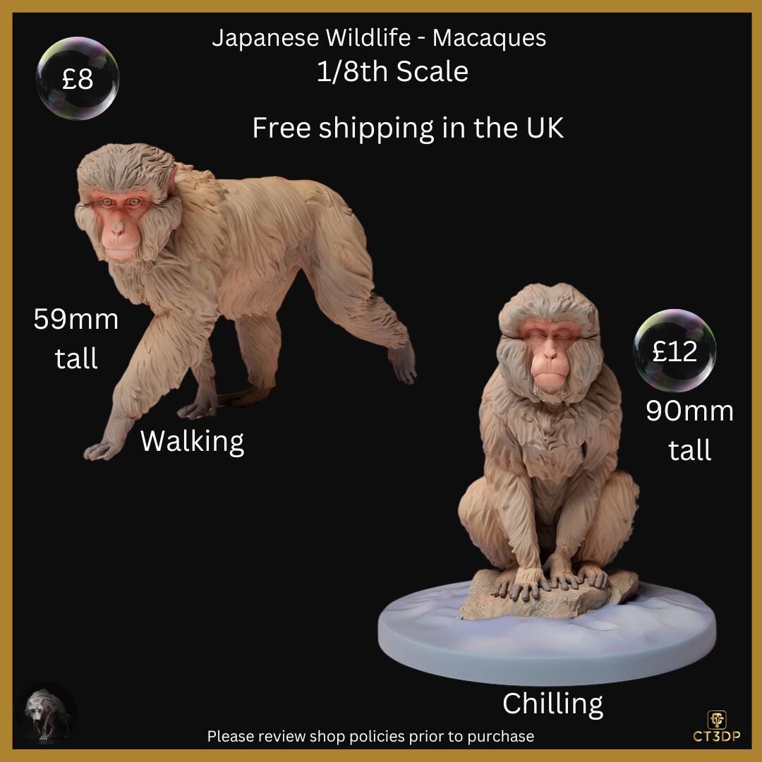 The Japanese Wildlife Collection -Macaques Chilling and Walking. Superb detail that captures the very nature of these cheeky Monkeys. The Japanese macaque (Macaca Fuscata), also known as the Snow Monkey, is a terrestrial Old World monkey species that is native to Japan. Colloquially, they are referred to as "snow monkeys" because some live in areas where snow covers the ground for months each year – no other non-human primate lives farther north, nor in a colder climate. Individuals have brownish-grey fur, pinkish-red faces, and short tails.