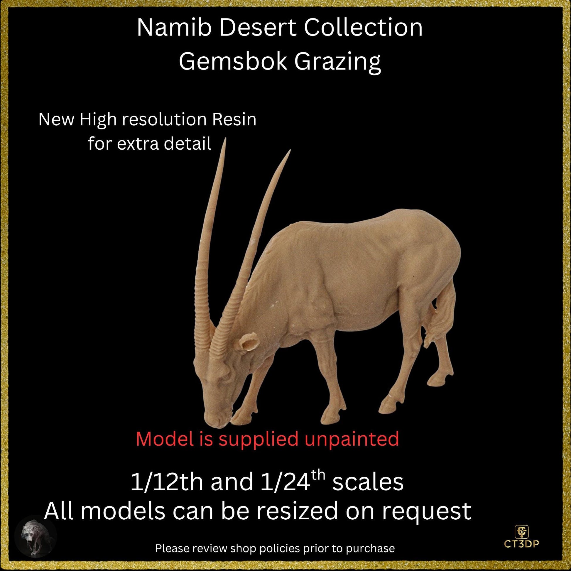 Add this stunning 1/24th or 1/12th scale model of the Gemsbok grazing to your African miniature wildlife collection. Stunning detail using a new High resolution resin- the details have to be seen to be believed. Make your selection at check out which model size.