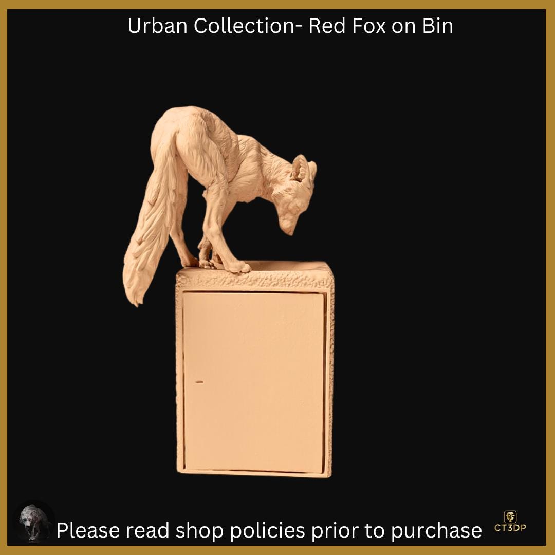 Here is the Urban City dwelling Red Fox on a bin top. Doing what he/she does best- scavenge for food. A regular sight in our cities and towns. The model is 1/12th scale